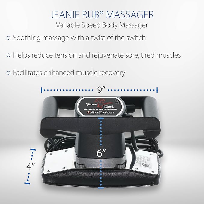 - QUALITY AND PERFORMANCE: The Jeanie Rub Variable Speed Massager, proudly assembled in Wisconsin, USA, delivers deep tissue relief without causing hand fatigue, reducing muscle fatigue and sore muscle while boosting circulation for faster recovery - trusted by chiropractors, athletes, and therapists.