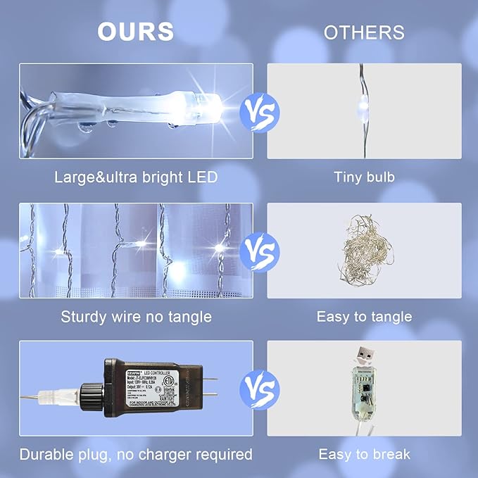 - SINCERE CUSTOMER SERVICE - If you are unsatisfied with our White Christmas Curtain Lights, please contact us. It is our goal to provide better products and meet more needs. INSTALLATION TIPS - How to install the curtain lights easily? firstly, untie and secure the main strand. and then, untie each string light. If you prefer a more closely spaced arrangement of lights, you can use clips or zip ties to space the light strings closer.