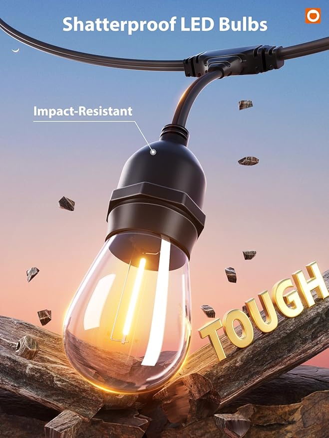 - Weatherproof & Heavy-Duty Construction : These ETL-listed, commercial-grade string lights are built for year-round use, featuring a dual parallel wiring structure that enhances flexibility and durability. The robust insulation shields against extreme weather—sun, rain, wind, snow, and dampness—ensuring reliable indoor and outdoor lighting performance.