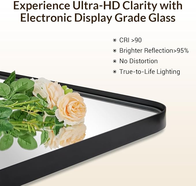 - An Artistic Luxury Black Mirror: An artistic display on its own, this mirror is a beautiful part of any home decorating scheme. Bring simple sophistication to any room with our 24" x 36" floating glass modern round corner black metal framed mirror. The plate glass mirror floats in the frame surrounded by a thin 1/12" gap.