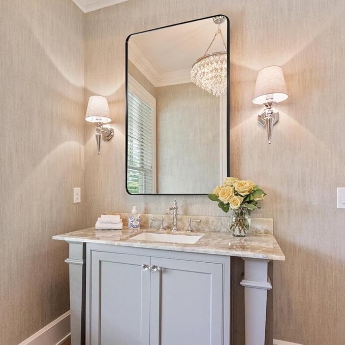 - Perfect Bathroom Mirror: This 24 x 36 inch mirror is the ideal size for a bathroom. The black metal frame adds elegance and class. The rounded corners lend a softness to the design. The polished mirror is presenting a beautiful reflection without any distortion of visual, the silver glass and premium MDF backing prevents corrosion in humid environments,make it perfect for bathroom.