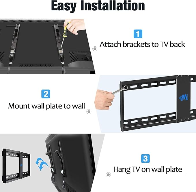 - [Low Profile Wall Mount for TV]: Slim TV wall mount keeps TV just 1.5’’ flush profile against wall, very much of streamlined and tidy looking, easy to blend in with any decor. Mounting TV over a TV stand, this TV wall bracket is greatly saving space for consoles on entertainment center.