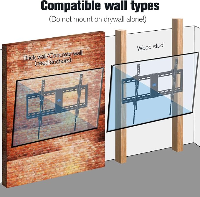- [Tilt TV Wall Mount]: Adjustable angled TV mount can be tilted by max 8 degree, to reduce screen reflection glare and neck/eye strain for better comfortable viewing. When the brackets are at 0°, this flat TV mount surely creates a sleek look. Search MD2163-K for the no tilt version flush wall mount.