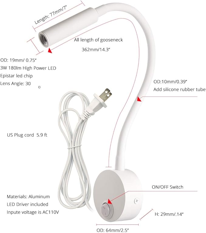 - Plug cord length 5.9 ft. AC85-265V. ON/OFF switch built on the base, 3W 160lm, White Finished, Warm White 3000K.