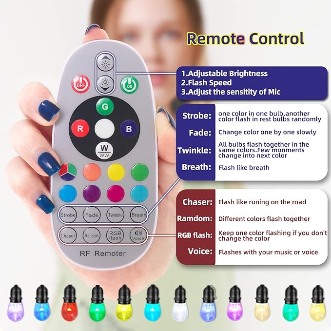 - MUSIC COLOR CHANGE: You only need to press the voice button on the remote control, Colourful Outdoor String Lights will turn on the music color change function, it will automatically change the color according to the music or ambient sound, it is the perfect atmosphere maker, the best for your holiday party Good partner.