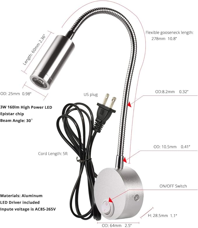 2 Pack Corded Wall Mount Lamp Reading Wall Light for Bed Easy Install AC85-265V (Silver, 2pcs Warm White 3000K)