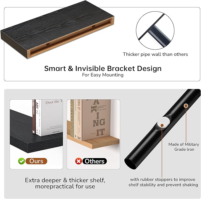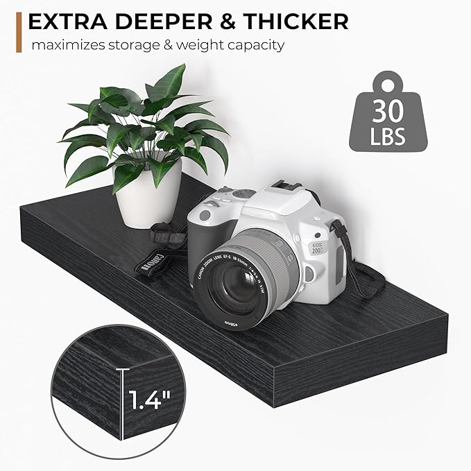 - Extra Deeper & Thicker - Each board measures 16"W x 6.7"D x 1.4"H. Extra deeper and thicker design in order to bring maximizes storage space and weight capacity, even hold up to 30 lb each. This floating shelf taking up zero square feet, reduces clutter and highlights décor in compact spaces.