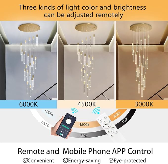 - Remote Dimmable Chandeliers - Crystal chandelier comes with LED dimmable bulbs and dimmer, you can control the light from 2700K warm light to 6000K white, and adjust the brightness from 5% to 100%, freely adjusted by remote controller any where (This chandelier has own dimmer and transformer, please do not use with any dimmer switch and dimming system !)