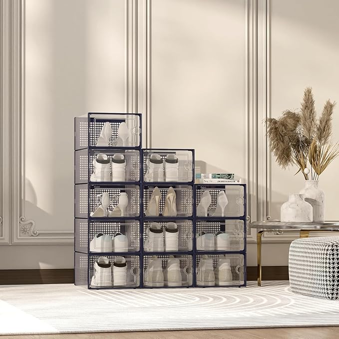 Kuject X-Large Shoe Storage Boxes Organizers Clear Plastic Stackable 12 Pack, Shoe Rack & Holder Substitute, Sneaker Containers, Toy Storage Organizer Bins for Entryway, Closet, Under Bed, Blue