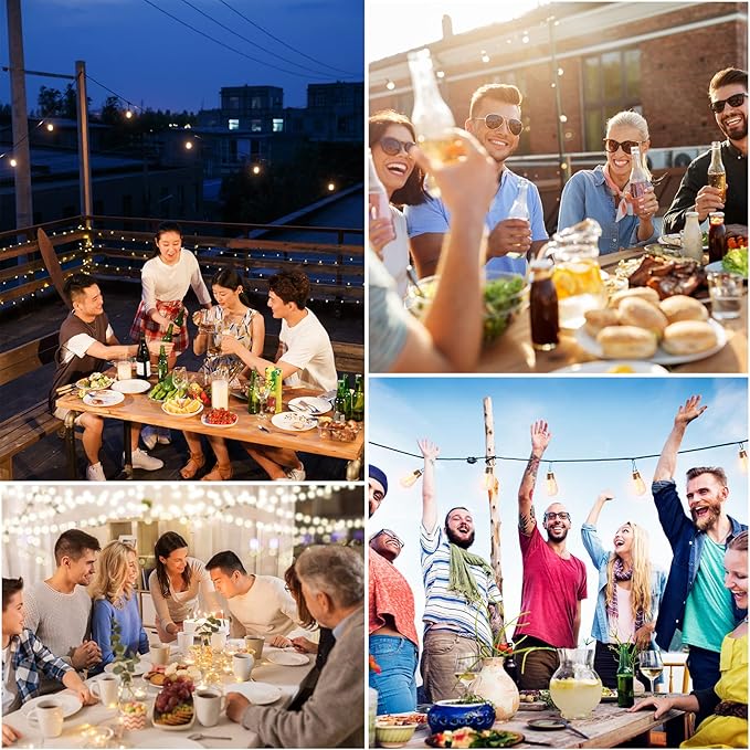 - 【Romantic Solar Outdoor String Lights】 The Solar Patio String lights are visually very beautiful. The warm light of the bulbs creates a calm and dreamy atmosphere. The outdoor string lights for patio can provide a relaxed and lively environment for your garden, patio, balcony, bedroom, pergola, cafe, birthday party, family gathering, evening cocktail party, or wedding reception and add more entertainment atmosphere.