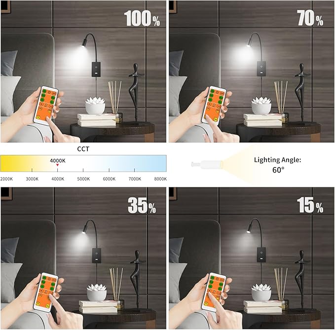 - 【Remote Control Wall Light】The wall mount bedside lamp with functional remote control by radio frequency signal. After correct code matching, the remote control can adjust the brightness smoothly or with 4 brightness levels (100%-75%-35%-15%). 4 levels timer function (10mins-20mins-1hrs-2hrs) is very helpful for night light before sleeping