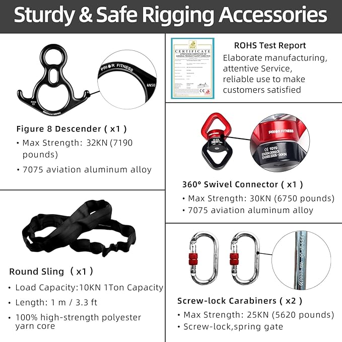 - 【Safety Tested & Guarantee】Aerial Silk is CE certified, SGS tested and recommended by certified aerial yoga teachers, Figure 8 Descender rated up to 32KN (7190pounds), 360°Swivel Connector (EN Certified) rated up to 30KN(6750 pounds), Daisy Chain Straps rated up to 10KN(2248 pounds),Screw-lock Carabiners (CE & EN Certified) rated up to 25KN(5620 pounds)