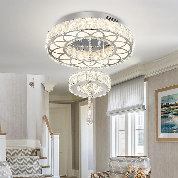 Flashing God Dia 12" Crystal Mini Chandelier Crystal Silver Ceiling Light Fixtures LED Flush Mount Ceiling Light for Living Room Bedrooms Dining Room Dimmable 2700k 4500k 6000k