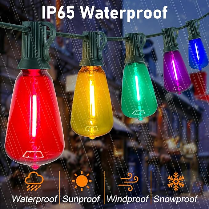 - Shatterproof and waterproof LED Patio Light : ST38 Outdoor Edison lights are made of plastic and are more shatterproof than all glass bulb types. Even if the cafe's string lights fall or are blown away, they are safer to use. Ip44 Waterproof and durable light strings can withstand extreme temperatures, rainy, windy or humid climates, these patio lights are weatherproof and able to withstand most normal weather conditions year-round.