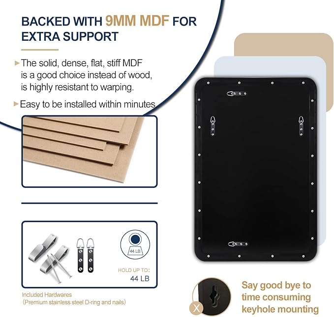 - Premium Quality: Our rustproof mirror is made with premium metal framing and 4mm HD glass, supported by a 9mm MDF backboard for shatterproof protection. The plate glass mirror floats in a thin 1/17" gap with a rounded corner design to soften your space