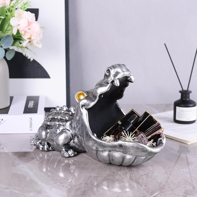 Alligator Statue Key Bowl, Fun Animal Statue Candy Dish for Entryway Decorative Bowl, Office Candy Dish, Big Mouth Sculpture Home Living Room Trinket Container Storage Box (Silver)