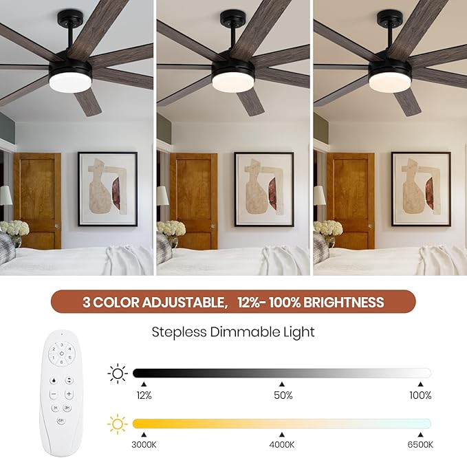 62 Inch Ceiling Fan, Outdoor Black Ceiling Fan with Light and Remote, 6-Speeds Reversible Motor, 7 Two-sided Blades Dimmable Noiseless, for Indoor Bedroom/Outdoor