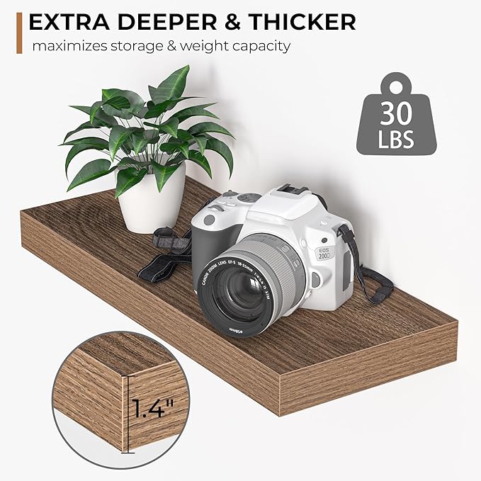- Extra Deeper & Thicker - Each board measures 16"W x 6.7"D x 1.4"H. Extra deeper and thicker design in order to bring maximizes storage space and weight capacity, even hold up to 30 lb each. This floating shelf taking up zero square feet, reduces clutter and highlights décor in compact spaces. even hold up to 50 lb each. This floating shelf taking up zero square feet, reduces clutter and highlights décor in compact spaces.