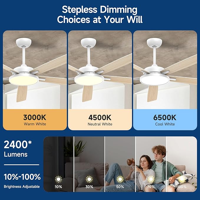 - Ultra-Thin LED Light with Stepless Dimming:This 62 inch ceiling fan with light is equipped with an ultra-thin 24W LED light that features stepless dimming for ultimate flexibility. Whether you want bright, energizing light or a soft, relaxing glow, you can smoothly adjust the brightness to your desired level. The sleek design fits perfectly with any modern interior, offering both style and functionality