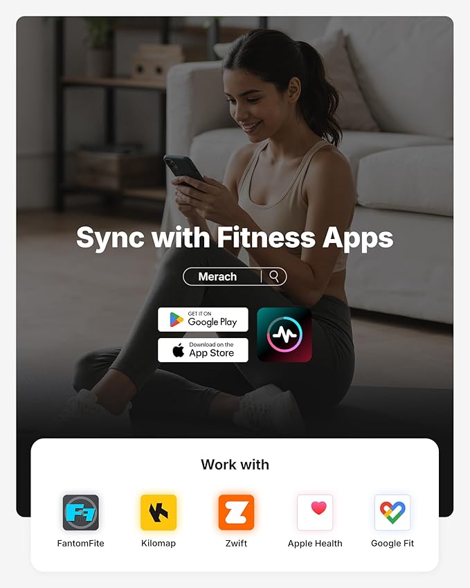 - Merach Self-Developed APP: Pair your Merach stationary exercise Bike with our self-developed fitness apps like Merach and FantomFite for a next-level training experience. Track real-time metrics like distance, time, calories, and BPM. Enjoy compatibility with KINOMAP and Zwift, and sync your data with Google Fit and Apple Health for every pedal with precision