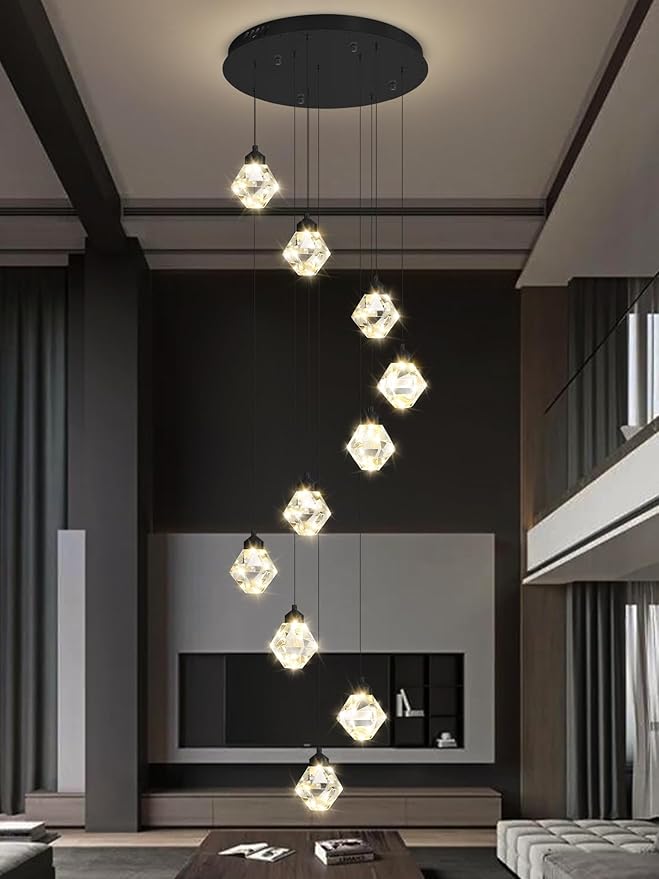 10-Light Chandelier Staircase Chandeliers for High Ceilings Crystal Chandeliers for Living Room Black Pendant Light Dimmable LED Hanging Light with Remote