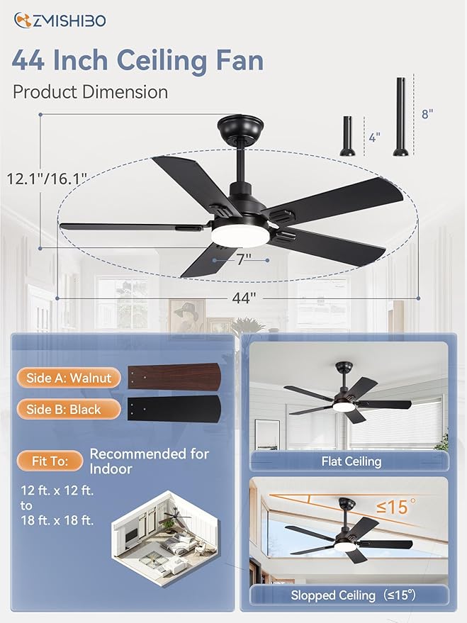 - 44 INCH CEILING FAN: The 44“ ceiling fan offers flat and inclined(<15°)mounting options, as well as 4" and 8" downrods. Recommended room size: 12 ft. x 12 ft. to 18 ft. x 18 ft. Ideal fans for living room, lounge, bedroom, kitchen