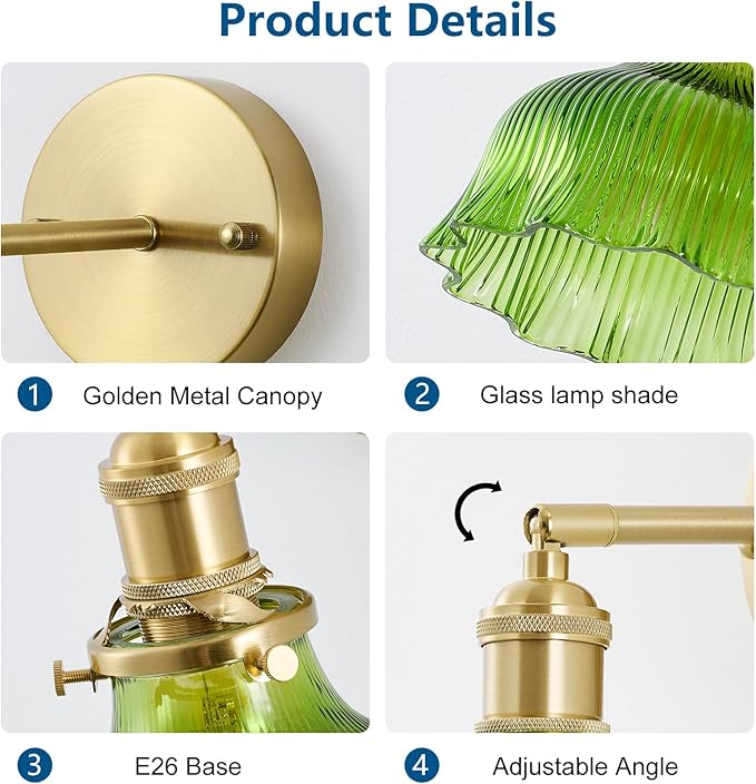 - Vintage Design: This wall sconce features a charming vintage-inspired style with a flower-shaped green glass shade and a gold-finished metal body.