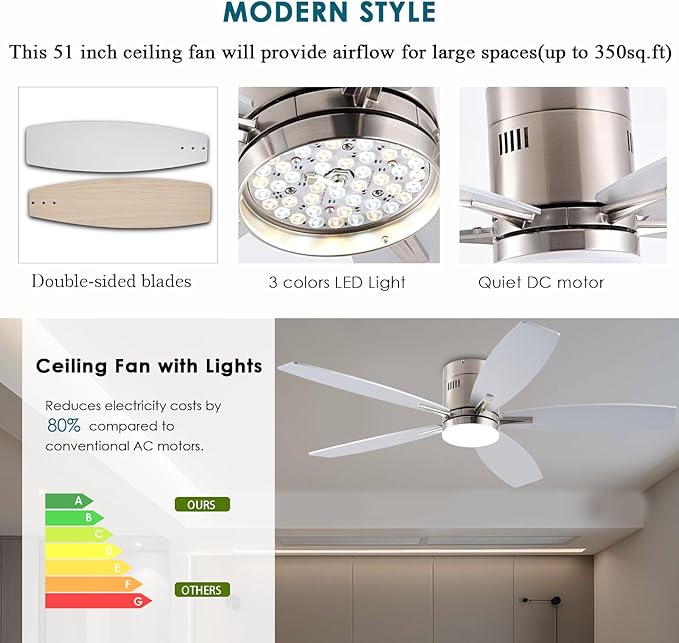 - Reversible DC Motor: The high-quality & high-speed motor brings a perfect wind experience. The wind speed can be adjusted in 6 gears, you can choose between comfortable wind, natural wind and strong wind. Reversible dual-direction fan improves air circulation to keep you warm in winter and cool in summer. Our fan blades are double sided in different colors, one side is Nickel color and the other side is walnut. Choose the fan blade color that best fits your home decor!