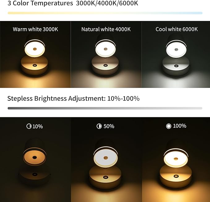 - Dimmable Wall Sconces: This sleek LED wall light with touch switch, offers 3 color settings—warm white (3000K), natural white (4000K), and cool white (6000K). Adjust the brightness from 10% to 100% to suit your needs, whether you want soft, subtle lighting or bright illumination. Easily switch to create the warm ambiance for any occasion