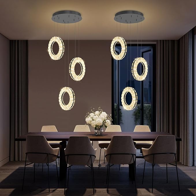 - 【Crystal Ring Chandelier Design】:The light body is crafted from exquisite circles of stainless steel and high-quality K9 crystal, It exudes a radiant and sophisticated aura, infused with a touch of contemporary allure.