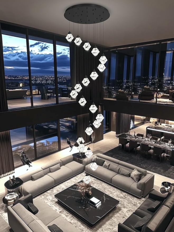H142in Modern Crystal Chandeliers Large Chandeliers for High Ceiling Black Pendant Light Fixture 26-Lights Large Pendant Light for Staircase Living Room Hallway Entryway