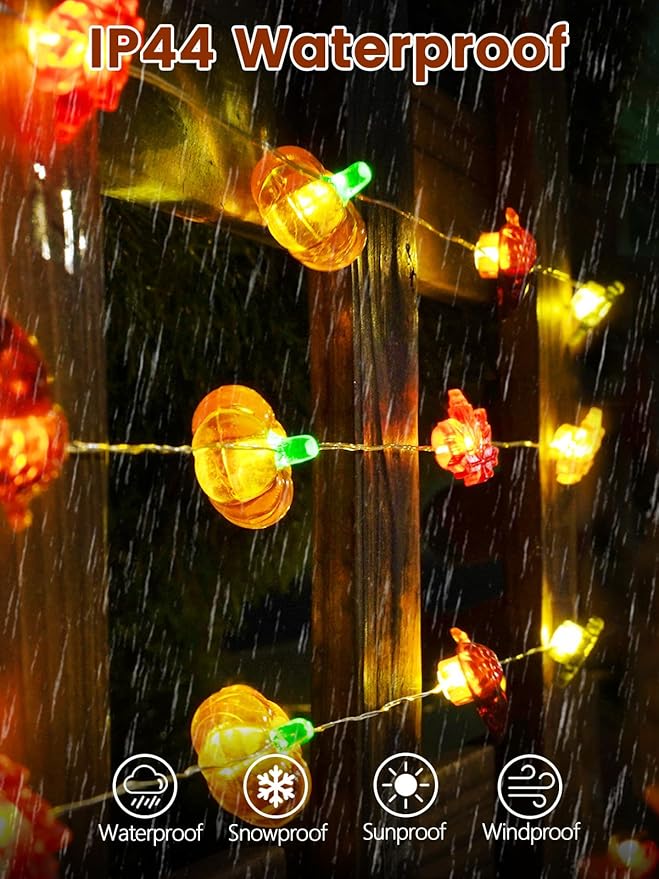 - IP44 Waterproof & safe: These Thanksgiving lights are designed with IP44 waterproof,perfect for any location,ensuring brilliant illumination on rainy days. Crafted from premium silver wire and powered by low-voltage, these Thanksgiving lights won't overheat even after hours of use.Note: the battery case is not waterproof—keep it away from water.