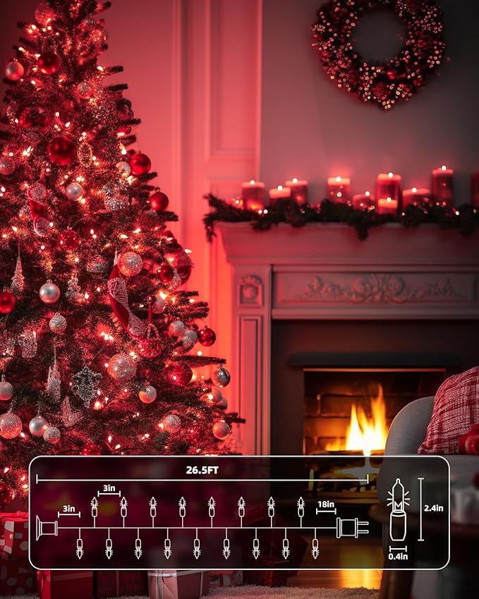 - 【Festive Mini Christmas Lights Set】This set includes 100 red incandescent mini-lights on 26.5 ft white wire, with bulbs spaced 3-inche apart and 18-inch lead wire. Perfect for holiday decorating, with the ability to connect up to 5 light strings end-to-end;