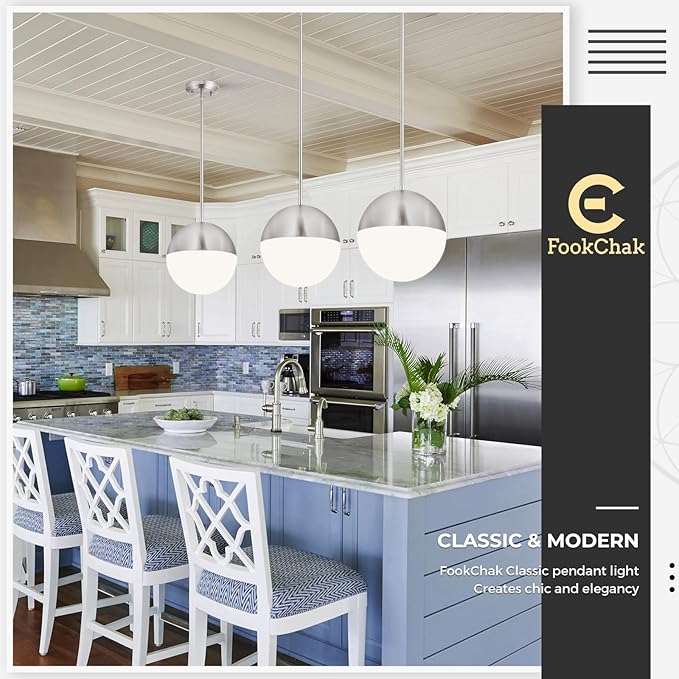 - Exquisite Craftsmanship – FookChak milky white globe kitchen island pendant light combines elegant handblown glass with a rust-resistant nickel metal shade, ensuring both timeless style and lasting durability. Meticulously designed, this globe pendant light fixture enhances any space with its refined aesthetic while offering reliable, long-term performance.