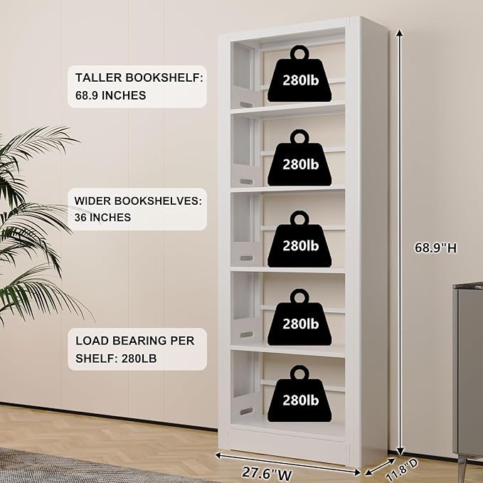 - 【Large Size】Size: H68.9*W27.6*D11.8 inch,our white bookshelf is taller and wider than the others.There are adjustable bookends on the back to stop the books from falling