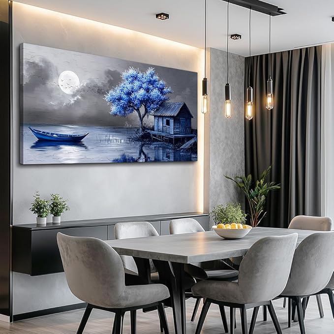 - Gallery-Ready Size & Design:30x60 inches (60x120 cm) blue boat on the lake framed canvas. Solid wood frame with waterproof finish creates a natural focal point for living rooms or offices.