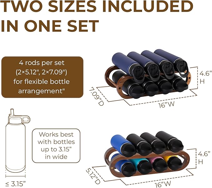 - ๐ ๏ธ [EASY TO SETUP]: This set includes one wine racks with four interchangable rods in two sizes โ 7.09" and 5.12". Easily switch between the rods to fit long or short bottles.