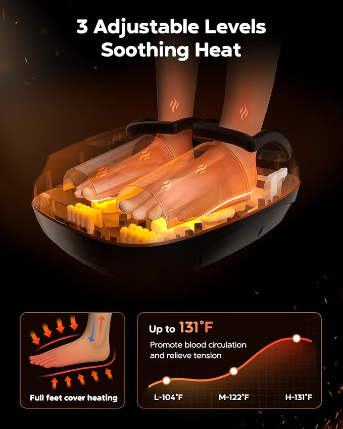 - Upgraded Heated Foot Massager: Our foot massager is upgraded with full foot cover heating function and 3 heating level(104-122-131°F). Unlike other foot massager that only provide foot bottom heating, our foot massager provides targeted soothing heat to the entire foot, sole and instep. This foot massager can quickly heat up to 131°F(55°C), helps to improve blood circulation, maintain muscle or skin vitality, and work as a foot warmer in winter.