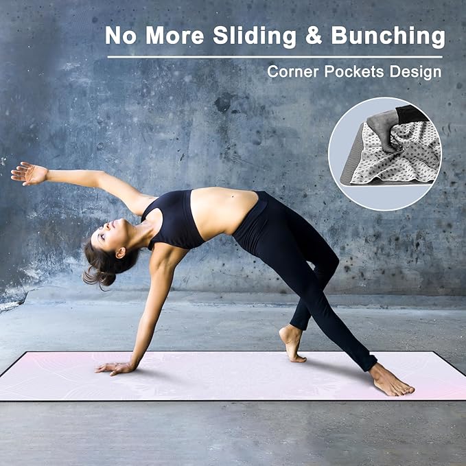 - Corner Pockets Design: Features 4 corner pockets on the backside, the non slip yoga mat towel helps secure and hold onto the mat firmly. This allows you to focus your mind, body and breath on the yoga practice, without worrying about bunching.