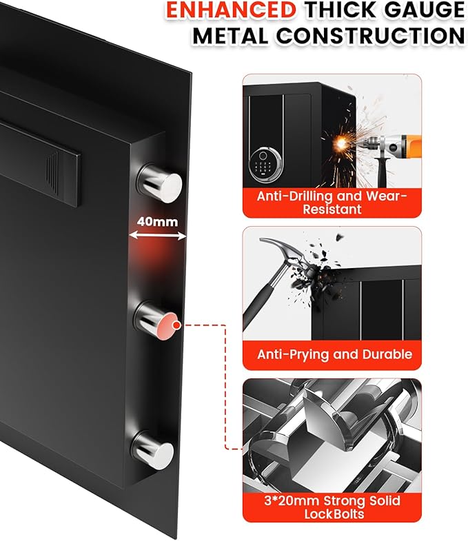 - 【STURDY & PRY-PROOF HOME SECURITY SAFE BOX】The large office safe is made of solid cold rolled steel integrally welded with recessed pry-resistant heavy duty door, and comes with 3 enhanced steel locking bolts, durable steel construction to keep your property safe. Scratch and stain resistant powder coating protects the safe from rust and damage. The sturdy construction adds an extra layer of security, deterring unauthorized access.