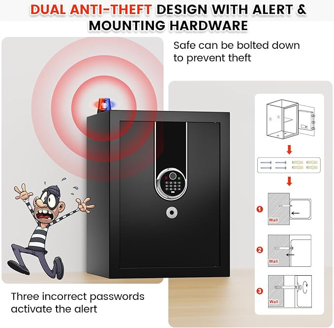- 【SMART TRIPLE ALERT & SECURE ANCHORS DESIGN】 The digital safe has an alarm if someone tries to get in 6 times (password or fingerprint) unsuccessfully. Press " 0# " to activate. The buzzer will beep when the safe is subjected to a vibration. It comes with mounting hardware, If you don't want it to ever move, you can bolt it down to concrete or closet and nobody will move it