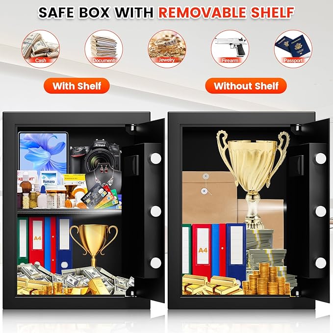 - 【LARGE DOCUMENT SAFE & FIREPROOF WATERPROOF BAG】The interior of the safe (13.5"W * 12D" * 19.3"H) is spacious, more than sufficient for guns, money, jewelry, documents and has a shelf to split the safe in half or remove for full use of larger items. The security safe comes with a extra fireproof waterproof bag which can withstand water splash and high temperatures, ensuring the safety of sensitive paperwork, family photos, birth certificates, and other valuables in case of a fire or flood.