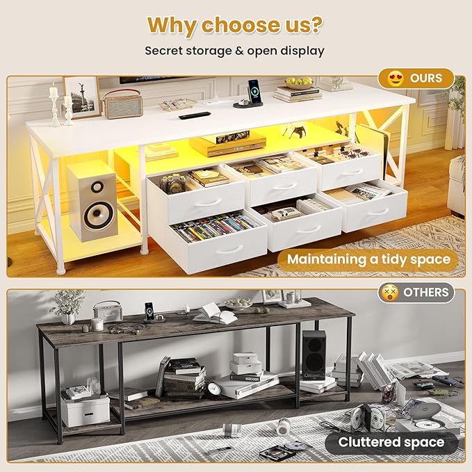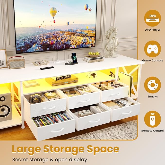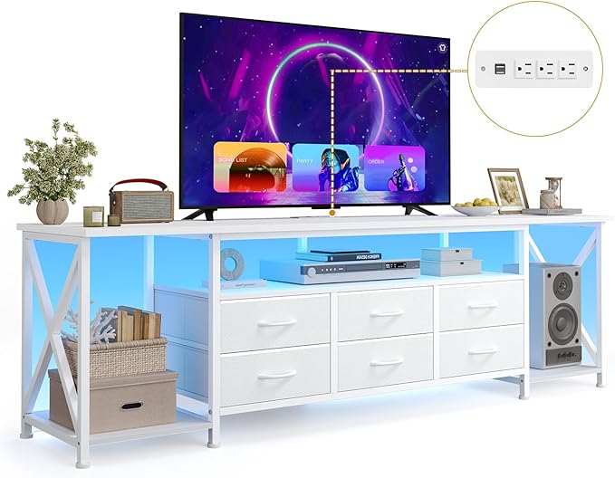 BTHFST TV Stand with LED Lights & Power Outlets, for TVs up to 85 Inches, 6 Fabric Drawers Entertainment Center with Open Storage Shelves, 71" TV Media Console Table for Living Room, Bedroom, White