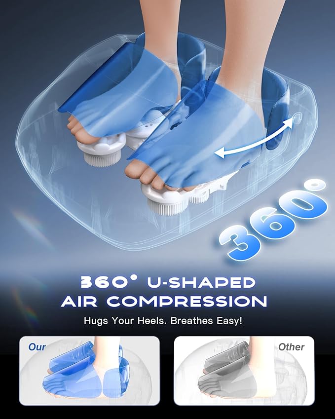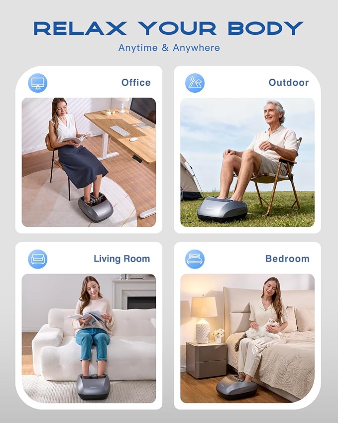 - 【FULL-COVERAGE FOOT PAIN RELIEF】 Experience professional-grade pain relief from heel to toe. This foot massager uses deep shiatsu kneading, rolling, and U-shaped air squeeze technique to work on tension muscles and ease foot pain. Ideal for office/sedentary workers or anyone seeking solutions for plantar fasciitis, neuropathy, or everyday foot discomfort.