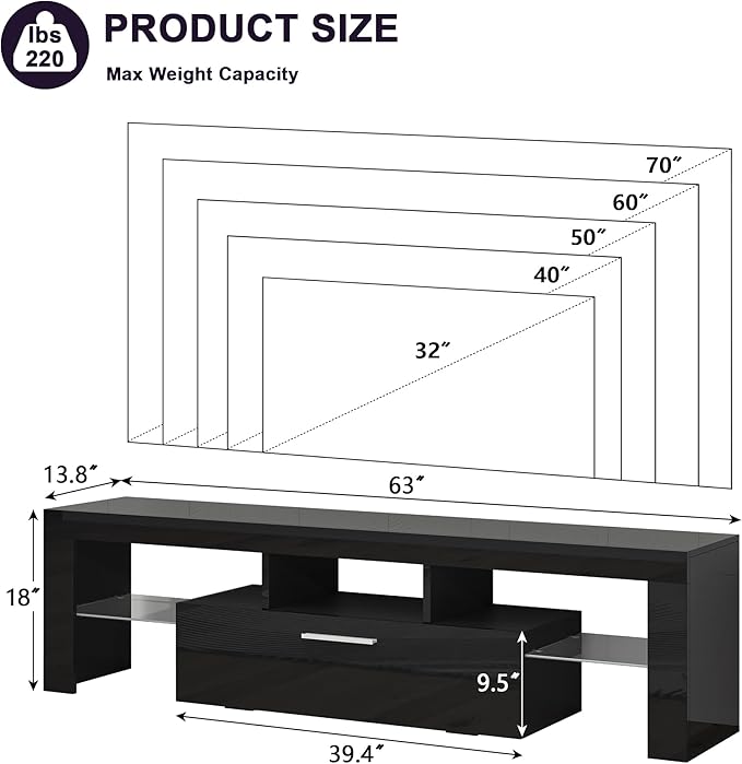 - 【Large Storage Space】- Wood TV stand Size: 63”W×13.8”D×18”H. The TV stand with storage has 2 large drawers and multiple open storage spaces for storing stereos, DVDs, game consoles, books and more. The tempered glass storage shelves on both sides can be easily removed, perfect for large items such as PS5 game consoles, which can easily achieve a neat and organized home space.