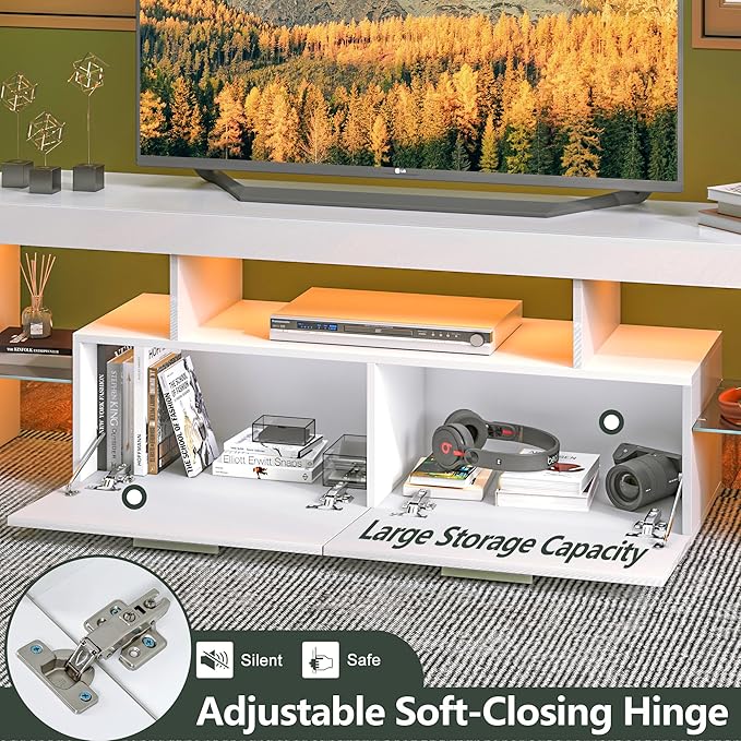 - 【Adjustable LED System】- LED TV stand is equipped with multi-color RGB lighting system, support mobile APP/remote control, more than 20 colors and dynamic light effects, you can adjust different brightness, synchronize the atmosphere of gaming or watching movies. 15 meters remote control distance, you can easily realize intelligent lighting control, adjust the brightness and color as you like.