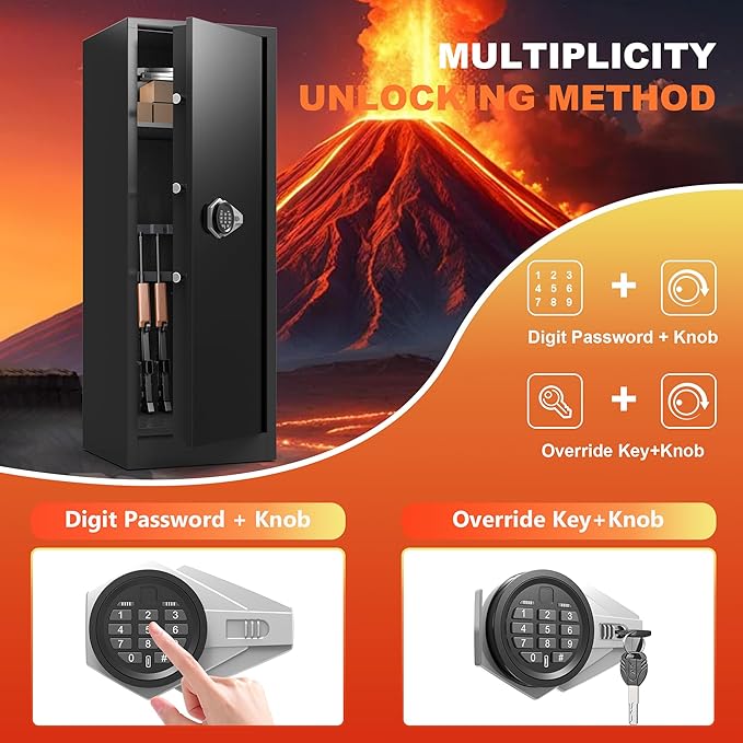 - 【Versatile Use & Space-Efficient Design】Boasting a spacious interior, this gun cabinet is also crafted with space-saving in mind. Its vertical standing design allows for seamless placement within closets, garages, or other built-in storage areas, enhancing both functionality and aesthetic appeal. Moreover, you have the flexibility to position this gun cabinet in various locations, such as your living room, bedroom, office, private club, truck, outdoor settings, or underground garage—essentially anywhere you desire. This cabinet is engineered to withstand diverse and challenging environments, ensuring the constant safety and security of your firearms.