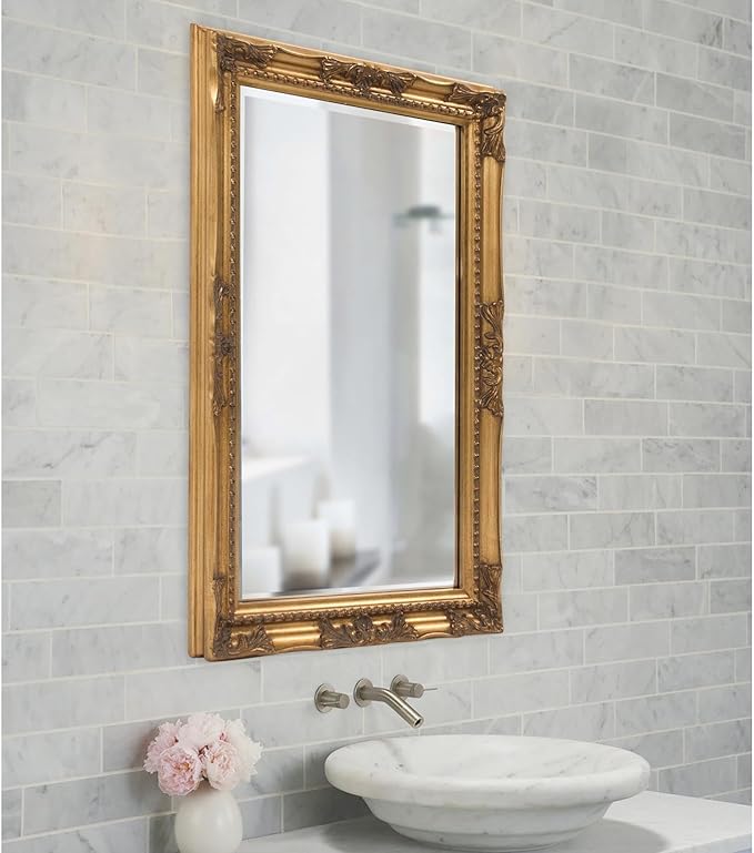 - BEAUTIFULLY BEVELED - For added detail and interest, the mirror's edge features a 1" bevelled edges with hardwood backing, Its a lovely gold bathroom mirror or gold vanity mirror.