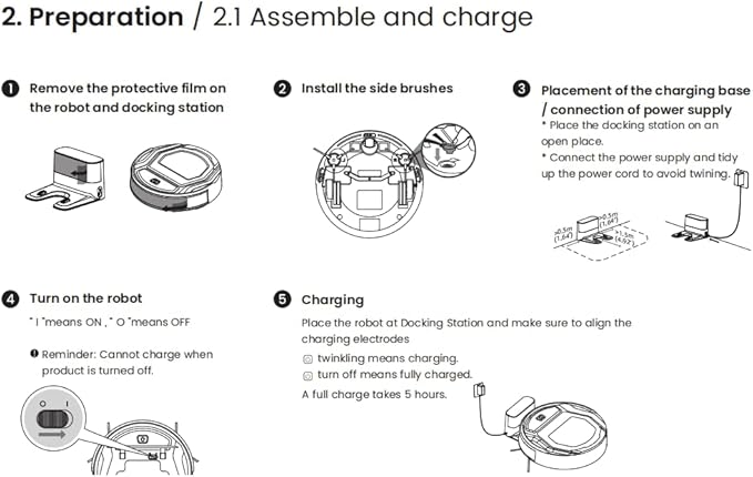 - ⚠Please read manual carefully before using the robot vacuum cleaner for home and hard wood floor.Fully charge for 5 hours before first use, keep the robot ON to charge, and always dock in a powered station for automatic recharging.