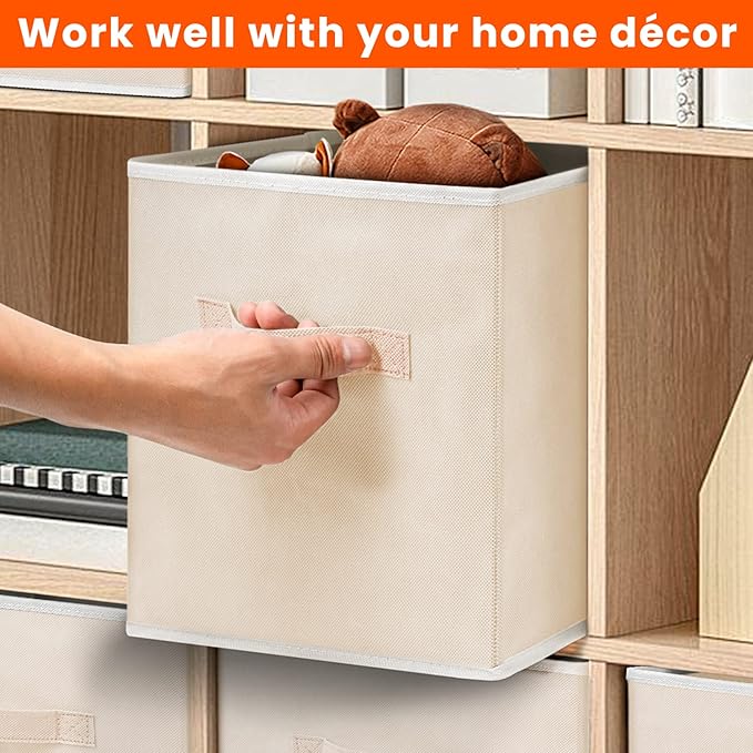 - 【FIT WITH MOST OF FURNISHING】Measuring 11x11x11 inches, our 8 pack beige storage bins could fit perfectly with most of cube organizer, shelf, closet, from bedroom to playroom to laundry room, to store clothes, linens, toyes, books etc.